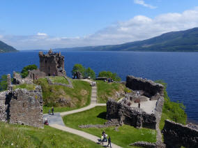 Eigentlich sind auf der Landzunge nur noch die Ruinen dieser Burg zu besichtigen, die bei einer Belagerung durch die Jacobiter von den Verteidigern selbst in die Luft gesprengt und nie wieder komplett aufgebaut wurde. Immerhin existieren derzeit ein begehbarer Turm und eine Reihe von Mauern. Hier ist auch ein Haltepunkt auf einer einstündigen Schiffsfahrt auf dem Loch Ness. An Bord wird den Reisenden am Getränke-Ausschank die Loch-Ness-Legende verkauft. Nessis`s monster Mash - a malty chestnut beer.
