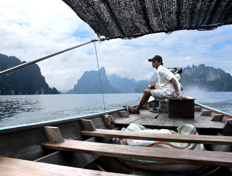 Bitte klicken Sie zur Vergrößerung auf die Fotos oben. Bild 1: Bis zu 1000 m hohe Kalkfelsen wachsen aus dem Rachabrapha-Stausee heraus. Bild 2: Die hölzernen Longtail-Boote sind das Hauptverkehrsmittel auf dem Stausee.