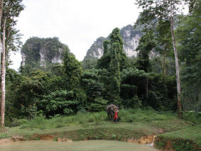 Im Nationalpark liegt auch das „Elephant Hills Camp“, eine Sozialstation für Elefanten. Als 1989 die Rodung der Wälder in Thailand verboten wurde, verloren nicht nur die Mahouts, sondern auch die als Arbeitstiere eingesetzten Dickhäuter ihre Existenzgrundlage. Fortan sah man die stolzen Riesen, einst Wappentier des alten Königreichs Siam, bettelnd durch die Städte ziehen, mit dem Rüssel Bilder malen oder Urlauber massieren Was für ein trauriges Schicksal… Fand auch Jonathan Chell, der Marketingmanager des „Elephant Hills Camp“.