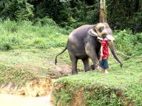 „Die etwa 2000 arbeitslosen Elefanten wieder in die Freiheit zu entlassen, geht nicht, da es kaum noch Gebiete gibt, in die sie sich zurückziehen können. Deshalb bieten wir den Tieren eine möglichst artgerechte Haltung. Außerdem wollen wir unsere Gäste für dieses Thema sensibilisieren, bei ihnen das Bewusstsein für diese traurige Problematik wecken.“ Und wie macht man das am besten? „Indem man den Elefanten nahe kommt“, sagt Chell, „den sanften Riesen das Essen zubereitet, sie füttert, abschrubbt und duscht.“Es ist nicht bewiesen, das im Land des Lächelns auch die Elefanten lächeln können. Auf jeden Fall fühlen sie sich im „Elephant Hills Camp“ wohl. Das sieht man ihnen an.