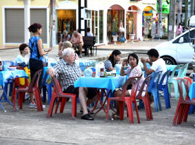 Hauptort der Region ist Takua Pa, ein kleines Städtchen von 20 000 Einwohnern. Links und rechts der Nationalstraße 4 werben Souvenirläden und Massagesalons um Touristen, ein Zahnarzt bietet seine Dienste an, die Apotheke preist Viagra in höchsten Tönen. Alle paar Meter verbreiten Straßenküchen ihren verführerischen Duft.