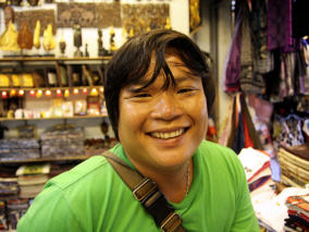 Bitte klicken Sie zur Vergrößerung auf die Fotos oben. Bilder 1 und 2: Garküchen und kleine Shops säumen die Nationalstraße 4, Bild 3: In den Kramläden gibt es bunte Stoffe, T-Shirts und Steinbuddhas, Bild 4: Angeblich hat ein Thailänder 700 Arten von Lächeln zur Verfügung.