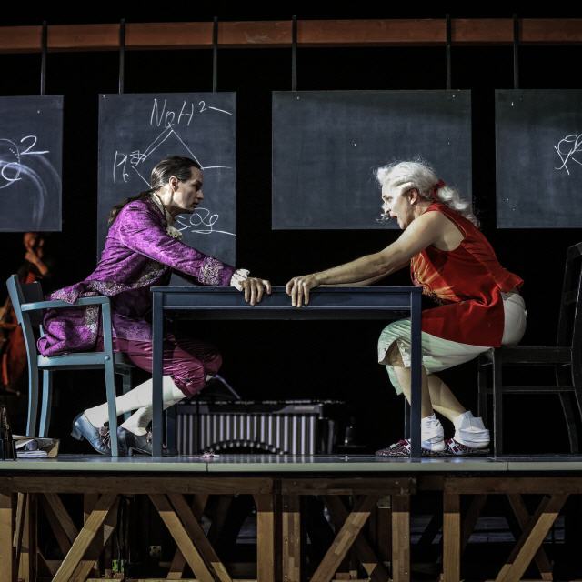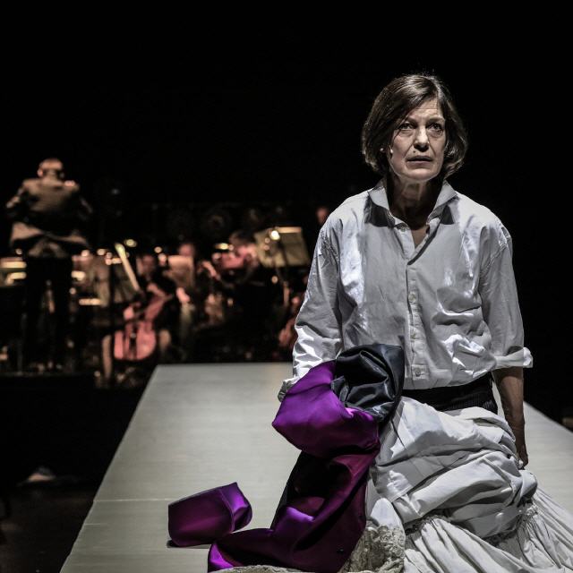 Wechselbanner mit optischen Eindrücken | Angela Winkler, Stephan Rügamer (Mozart), Roman Trekel (Salieri), Max Renne, Musikerinnen und Musiker der Staatskapelle Berlin, © Staatsoper Berlin