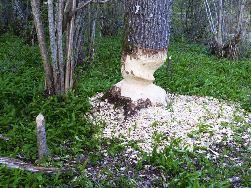 Der Stamm eines riesigen Baumstammes ist rundherum angenagt und die Holzspäne sind überall rund um den Baum verteilt. Plötzlich taucht an der Wasseroberfläche der Kopf eines Bibers auf, der sich langsam von der Uferböschung in die Mitte des kleines Flüsschens bewegt. Er scheint erst mit Verzögerung unsere zwei Kanus zu entdecken, schlägt mit seinem Schwanz auf die Wasseroberfläche und verschwindet aus dem Blickfeld. So kurz kann die Begegnung auf einer Biber-Safari im Naturpark sein.