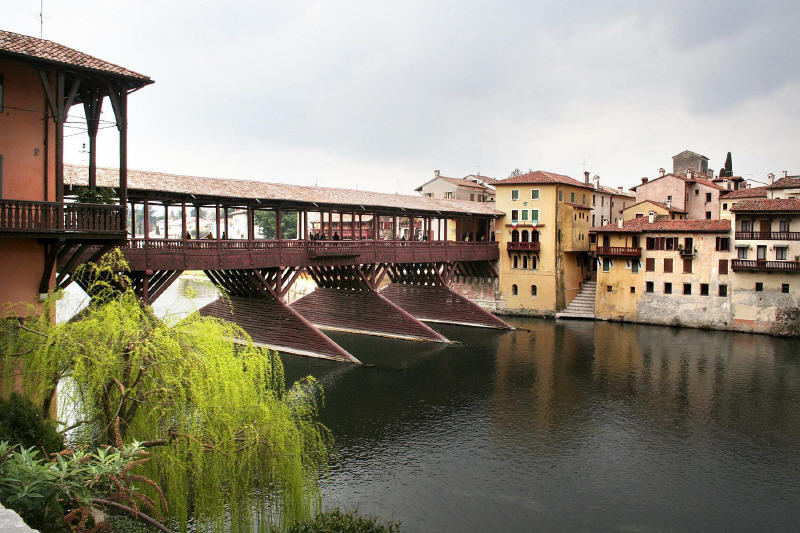 Also entwarf Palladio eine Brücke aus elastischem Holz. Mit vier trapezförmigen Stützpfeilern, die der Stromrichtung des Flusses angepasst waren. Darauf legte er eine Balkenlage und verschönerte das Gerüst mit einer toskanischen Kolonnade zum Stützen des Daches. Stabil und edel. So steht die Brücke noch heute da. Allerdings musste sie zwei Mal in ihrem Leben neu erbaut werden. Das erste Mal nach 200 Jahren, das zweite Mal wurde sie ein Opfer des 2. Weltkrieges. Deutsche Soldaten zerstörten das Wahrzeichen Bassanos. Beide Male wurde sie nach Originalunterlagen wieder aufgebaut.