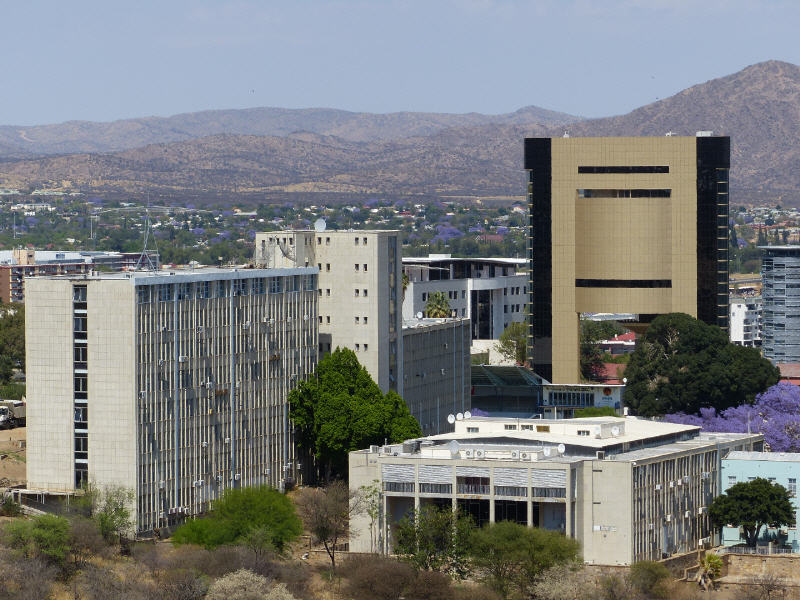 Auf einer Anhöhe im Stadtgebiet ist viel Grün in Gärten und im Oktober bläulich blühende Jacaranda-Bäume zu erkennen. Im Zentrum der Stadt überragt ein modern gestalteter Turm einige Bürohäuser – das Unabhängigkeits-Gedenkmuseum von Namibia.