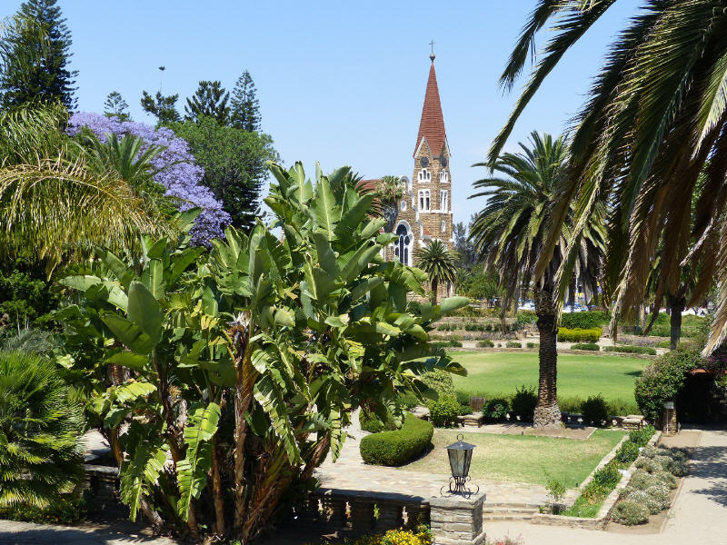 Auch auf einem Spaziergang durch Windhoek, dem wirtschaftlichen und kulturellen Zentrum Namibias mit der einzigen Universität des Landes, entdeckt man überall Spuren deutscher Kolonialzeiten und sich wandelnder Geschichte in Straßennamen. Da erhebt sich die neoromanische Christus-Kirche, angrenzend ein schöner gepflegter kleiner Park.