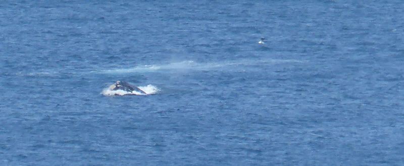 Hier von der Küstenstraße kann man sie beobachten: die Walfische. Sie tauchen in unregelmäßigen Abständen immer wieder im Meer auf und erzeugen kleine Schaumkronen. Es sind tatsächlich mehrere Wale, die sich nur wenige hundert Meter vom Strand tummeln. Die immer wieder auftauchenden Rücken und Schwanzflossen der Wale ziehen alle Aufmerksamkeit auf sich.