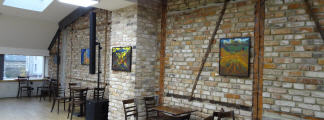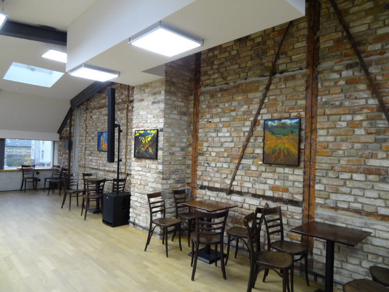 Im Konferenzraum an der Ziegelwand von links nach rechts: "Teilung" - "Blaue Baum im Paradies" - "Neubeginn II" - "Neubeginn I"