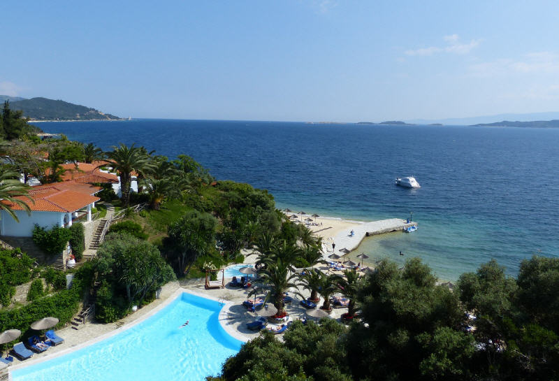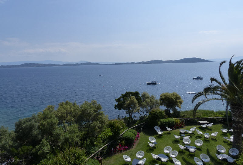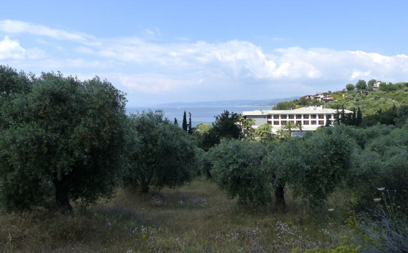 Die Kolonien der Seeadler haben sich auf die knapp vier Kilometer entfernte Insel Amouliani zurück gezogen, auch in Sichtweise vom Hotel. Dafür sind heute auf dem weitläufigen Gelände Eagles Palace viele Schwalben unterwegs. Und in den üppigen Gartenanlagen mit hohen Palmen, Pinien, Zypressen,Wacholder und Blumenrabatten singen im Frühjahr und Sommer sogar die Nachtigallen.