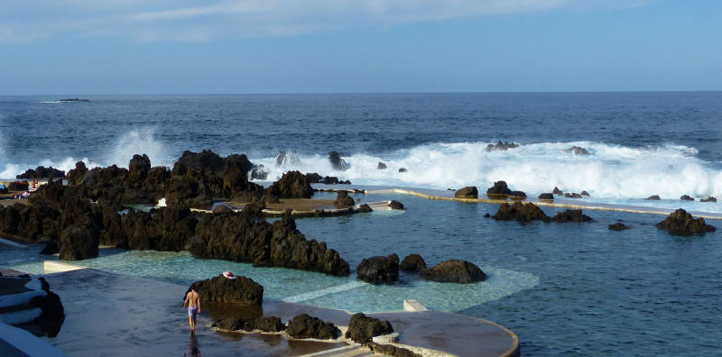 Der kleine Ort Porto Moniz an der nordwestlichen Küste hat eine Besonderheit zu bieten. Die starke Brandung hat mit der ständigen Erosion von Wind und Wasser im Lavagestein natürliche Fels-Badebuchten geschaffen. Verbunden durch einige schmale betonierte Wege und ein paar Betonflächen zum Sonnen sind ideale Meeresschwimmbecken entstanden. Sie erhalten durch die heran rollenden Brecher des Atlantiks immer wieder einen Zufluss, behalten aber durch das per Sonne aufgewärmte Wasser noch eine erträgliche Wassertemperatur.