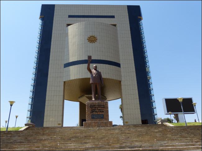 Vor dem Museum wird der Besucher am Treppenaufgang durch die überlebensgroße Figur von Sam Nujoma, dem SWAPO-Führer und Gründungspräsidenten des Landes empfangen. Sein rechter Arm ist ausgestreckt und in der rechten Hand hält er die Verfassung des Landes. In seiner Nähe ist eine Frau und ein Mann aus Namibia dargestellt, die symbolhaft ihre Ketten gesprengt haben. Sie recken triumphierend ihre Arme in die Höhe, gerade an jener Stelle, wo der aus Bronze gegossene Reiter der deutschen Schutztruppe Windhoek bewachend für alle Zeiten aufgestellt war. Aber wo ist der Südwester Reiter geblieben?