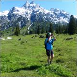 Das Gras und die Blumen auf der Alm stehen dichter und da ist es für die Wanderführerin an der Zeit, alle, die es mögen, aufzufordern, die Wanderstiefel auszuziehen und barfuss weiter zu laufen. Mit den Ferngläsern ist in den Bergen die Werfen-Hütte in etwa 2000 Meter Höhe zu sehen. Wir erfahren, dass sie über Hubschrauber versorgt wird und in dieser Saison ein Sherpa aus Nepal für die Saison engagiert wurde, ein Fachmann aus Nepals Bergen sozusagen.