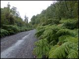 Der Weg in den Süden führt auch durch den Valdivia-Urwald, den zweitgrößten Regenwald, der außerhalb der Tropen liegt und durch feuchtes, kühles Klima der Westanden in Chile geprägt ist. Der größte Teil wurde bereits in der Vergangenheit durch die Holzindustrie zerstört. Die kahl geschlagenen Flächen wurden und werden mit schnell wachsenden fremdländischen Baumarten aufgeforstet, was eine zusätzliche Belastung für das ökologische Gleichgewicht darstellt. Im Bild l.: Straße durch den Valdivia-Regenwald