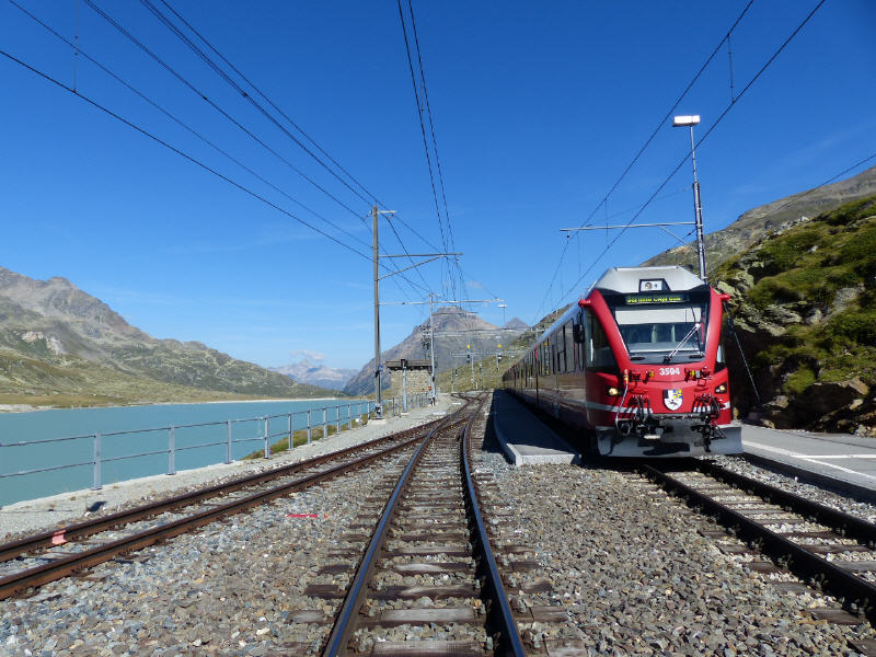 Die Bahn steigt weiter, die Waldgrenze liegt bereits hinter ihr, karge Bergwiesen bestimmen jetzt die Landschaft. Noch ein paar Kehren weiter und es breitet sich der Lago Bianco aus, der weiße See. Er nimmt das Schmelz-Wasser von Gletschern auf und hat eine grünlich milchige Färbung. Dann ist der Bahnhof Ospizio Bernina erreicht, mit 2253 Metern der höchste Punkt der Strecke (links im Bild: Maloja Pass).