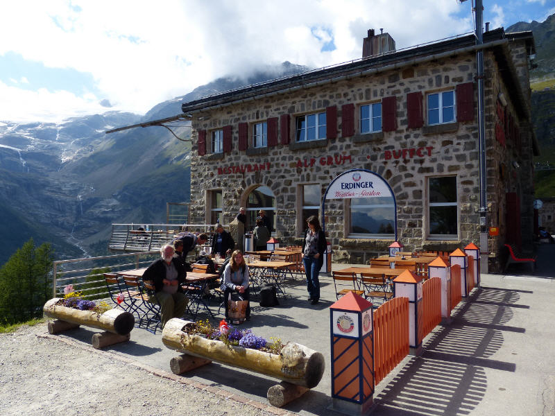 Während in Alp Grüm die unmittelbare Umgebung noch aus Gletschern und karger alpiner Vegetation mit rauem Klima besteht, ist nach einer Stunde Fahrzeit Tirano erreicht und alles anders. In dem oberitalienischen Städtchen stehen Palmen, blüht Oleander und der Cafe Latte wird unter dem Sonnenschirm getrunken.