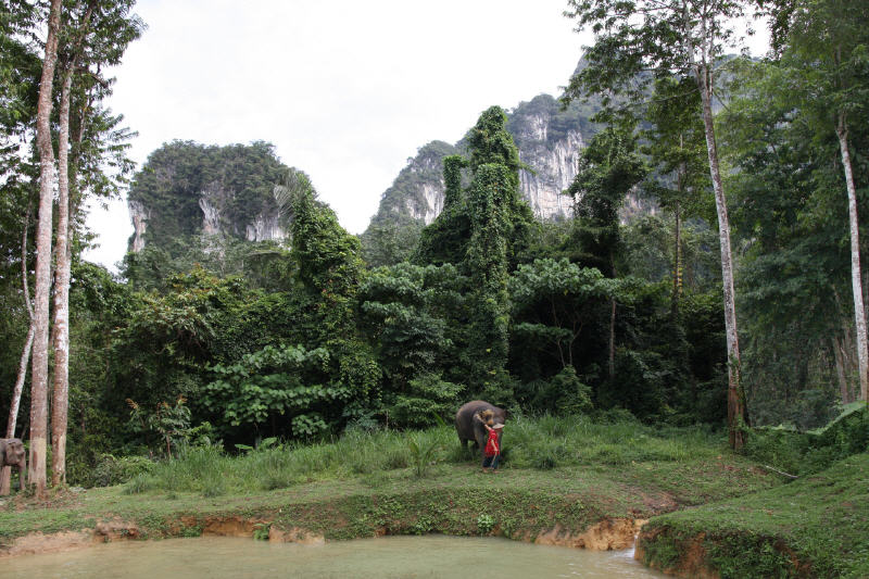 Im Nationalpark liegt auch das „Elephant Hills Camp“, eine Sozialstation für Elefanten. Als 1989 die Rodung der Wälder in Thailand verboten wurde, verloren nicht nur die Mahouts, sondern auch die als Arbeitstiere eingesetzten Dickhäuter ihre Existenzgrundlage. Fortan sah man die stolzen Riesen, einst Wappentier des alten Königreichs Siam, bettelnd durch die Städte ziehen, mit dem Rüssel Bilder malen oder Urlauber massieren Was für ein trauriges Schicksal… Fand auch Jonathan Chell, der Marketingmanager des „Elephant Hills Camp“.