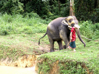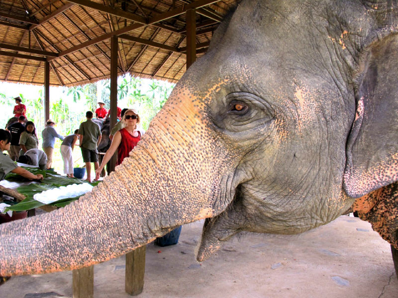 „Die etwa 2000 arbeitslosen Elefanten wieder in die Freiheit zu entlassen, geht nicht, da es kaum noch Gebiete gibt, in die sie sich zurückziehen können. Deshalb bieten wir den Tieren eine möglichst artgerechte Haltung. Außerdem wollen wir unsere Gäste für dieses Thema sensibilisieren, bei ihnen das Bewusstsein für diese traurige Problematik wecken.“ Und wie macht man das am besten? „Indem man den Elefanten nahe kommt“, sagt Chell, „den sanften Riesen das Essen zubereitet, sie füttert, abschrubbt und duscht.“Es ist nicht bewiesen, das im Land des Lächelns auch die Elefanten lächeln können. Auf jeden Fall fühlen sie sich im „Elephant Hills Camp“ wohl. Das sieht man ihnen an.