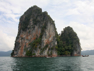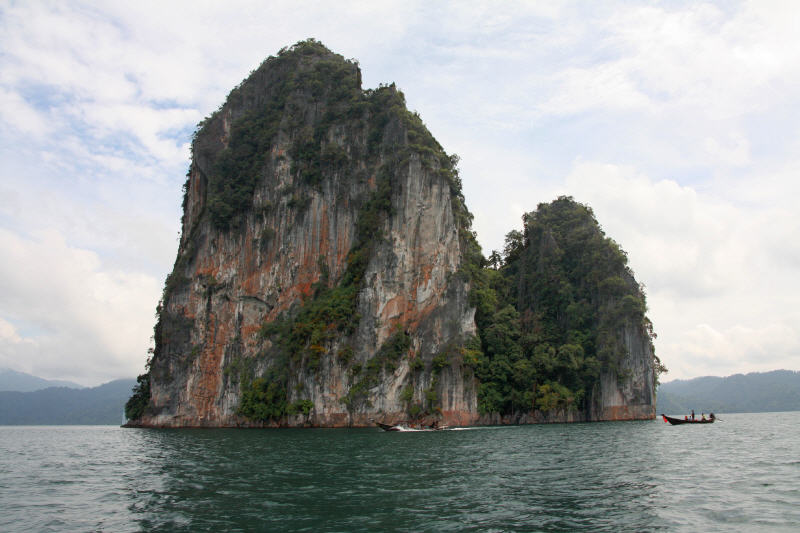 Bitte klicken Sie zur Vergrößerung auf die Fotos oben. Bild 1: Bis zu 1000 m hohe Kalkfelsen wachsen aus dem Rachabrapha-Stausee heraus. Bild 2: Die hölzernen Longtail-Boote sind das Hauptverkehrsmittel auf dem Stausee.