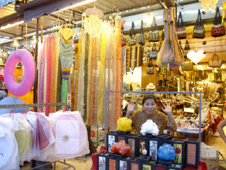 Bitte klicken Sie zur Vergrößerung auf die Fotos oben. Bilder 1 und 2: Garküchen und kleine Shops säumen die Nationalstraße 4, Bild 3: In den Kramläden gibt es bunte Stoffe, T-Shirts und Steinbuddhas, Bild 4: Angeblich hat ein Thailänder 700 Arten von Lächeln zur Verfügung.