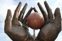 Klicken Sie zur Vergrößerung auf die Abbildungen. Ergänzende Bildunterschrift zu Bild zwei: Die von zwei Händen umarmte Kugel „symbolisiert die sozialen und politischen Ergebnisse der letzten drei Jahrzehnte“, schrieb Istvan Kiss, der Künstler des 1976 geschaffenen Werkes.