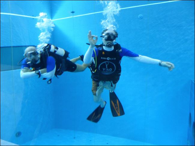 Im Vergleich zum bisherigen Spitzenreiter, dem belgischen Tauchzentrum Nemo 33 bei Brüssel, geht es in Montegrotto noch sieben Meter tiefer. Doch diese spektakuläre Anlage solle nicht nur ein Treffpunkt zum Training für Spezialisten der Unterwassertechnik oder der Feuerwehr sein, so der Betreiber Boaretto. „Wir laden natürlich auch Sport- und Freizeittaucher aus der ganzen Welt ein und darüber hinaus auch alle Neugierigen, die einen Tauchschein ablegen wollen.“ Und wer sich von unseren Urlaubern nur einmal ausprobieren will, so Boaretto (im Bild links) weiter, der müsse nur den Einstiegspreis für eine Tauchstunde von 35 Euro zahlen und seine Badehose mitbringen.