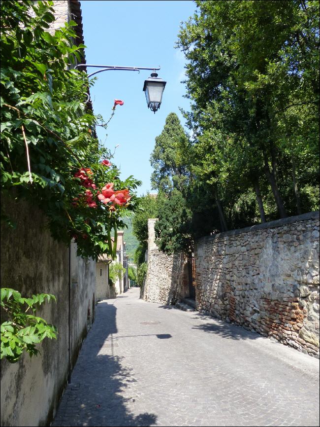 Das Ziel, der kleine Ort Arquà Petrarca, ist erreicht. Wenn nicht gerade ein geparktes Auto oder eine Werbetafel im Weg steht, empfängt den Besucher bei einem Rundgang die Magie des Mittelalters. Vom Ortskern mit der Dreifaltigkeitskirche gehen kleine Seitengassen aus mit schlicht und massiv gebauten Häuser. Ihre wieder kehrenden baulichen Elemente gehören mit Blumen geschmückte Eingänge und Fenster, eine Loggia und ländliche Kamine.