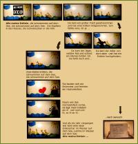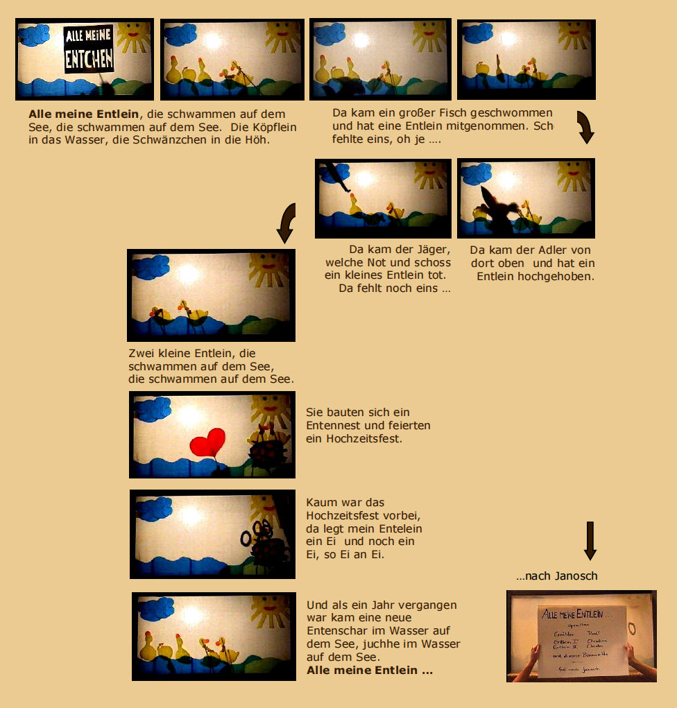 Rechts im Bild: Screenshots vom Videoclip "Alle meine Entchen". Einst wurde das Kinderlied als Schattenspiel aus Zeitungspapier und diversen Utensilien gestaltet.
