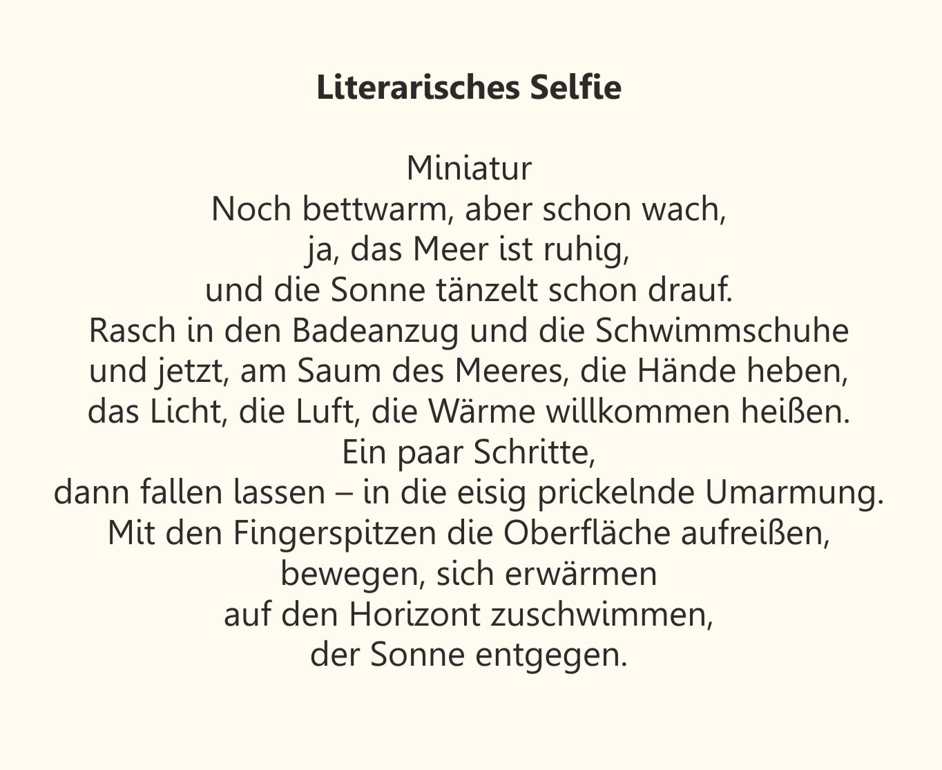 Was ist ein „Literarischen Selfie“? Gertie Wagerer weiß mehr darüber zu berichten: „Sicher kennen Sie auch diese Momente, in denen alles stimmt – innen und außen. Gipfelerlebnisse nannte es Abraham Maslow. Manchmal fallen sie mit bedeutsamen biografischen Ereignissen zusammen: jemand hält um Ihre Hand an, die Prüfung ist geschafft, der Berg bezwungen. Es können aber auch scheinbar ganz unbedeutende Gelegenheiten sein, bei denen jemand wie ich, der gerne fotografiert, die Kamera zücken möchte und zugleich weiß, das Wesentliche kann das Bild nicht festhalten: das Schwingen in der Bauchgegend, den Duft der Föhren, die Gedankenblitze im wohlig-förderlichen Gespräch. Da kam mir die Idee, das doch schreibend festzuhalten und ich nenne diese Momentaufnahmen: „literarische Selfies“. Weiterlesen ...
