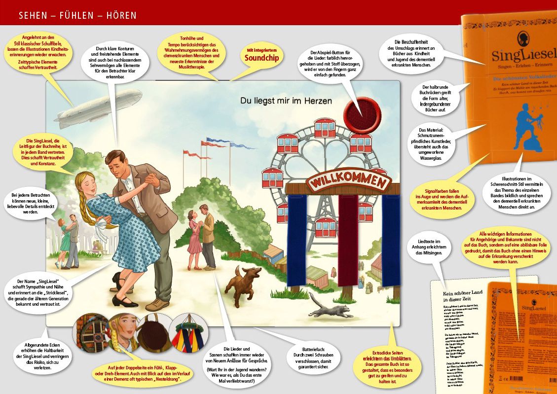 Die wunderschön im Stil klassischer Schulfibeln gestalteten Bücher sind vielseitig: Aktives Mitsingen, Abspielen bzw. Zuhören und Tasten durch Fühl-, Klapp- und Drehelemente sind alleine oder begleitend möglich. Die Leitfigur der „Sing-Liesel“ schafft Sympathie und Vertrautheit, ebenso zeittypische Elemente und Szenen, die immer wieder Anlässe für Gespräche bieten. So können schon verblasste Erinnerungen der Demenzkranken wieder neu geweckt werden.
