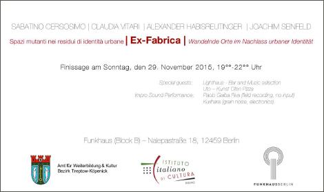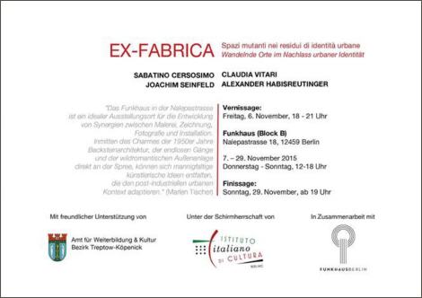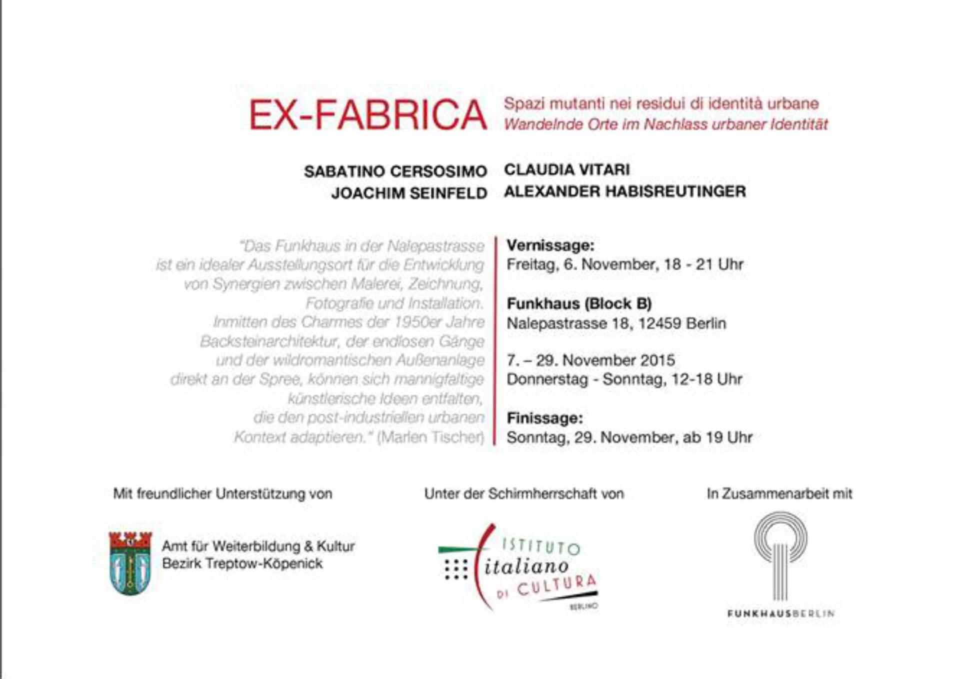 Für die erste Station der Ausstellung „Ex-Fabrica“ haben Vitari und Cersosimo zwei deutsche Künstler zur Kollaboration eingeladen. Ähnlich wie Vitari's und Cersosimo's Arbeiten, zeigen die Arbeiten von Alexander Habisreutinger und Joachim Seinfeld Spuren, welche die post- industrielle Umgebung ihrer Ateliers im Funkhaus, der früheren Pruduktionsstätte des DDR Rundfunks, widerspiegeln.