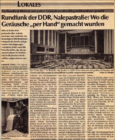 1996 statteten Gerhard Gundermann und Barbara Thalheim dem Funkhaus Nalepastraße auch einen Besuch ab. Oben ein YouTube-Snapshot mit Blick in eines der ehemaligen Sendestudios, bei dem die Technik längst ausgebaut wurde. Siehe auch Dokumentation Funkstille.