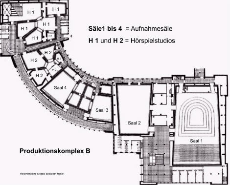 Am 10. Februar 1956 konnte der Block B - bestehend aus einem äußeren Haus mit acht inneren Häusern ( vier Säle und zwei Hörspielstudios) übergeben werden. Sensitiv-Collage: